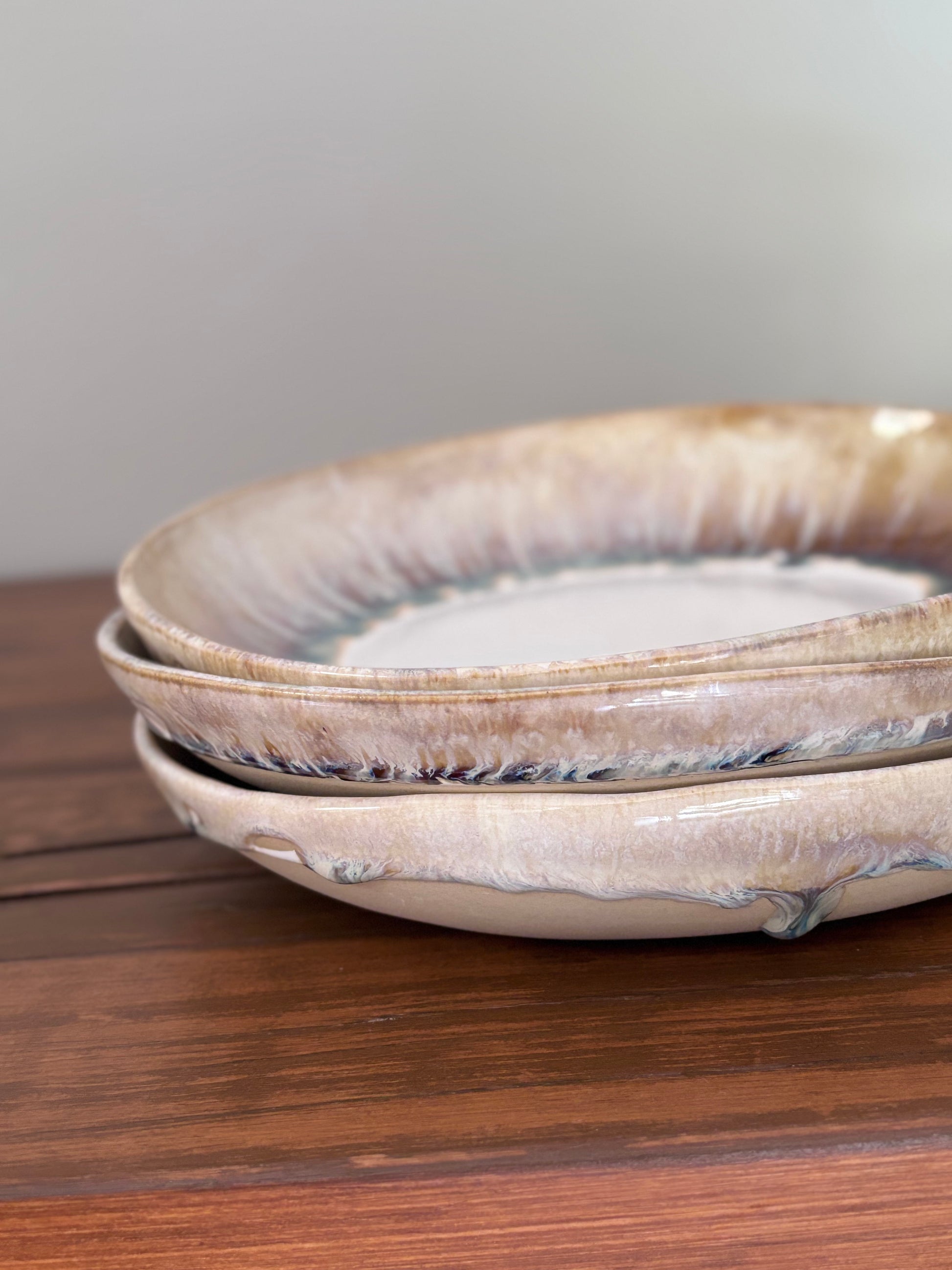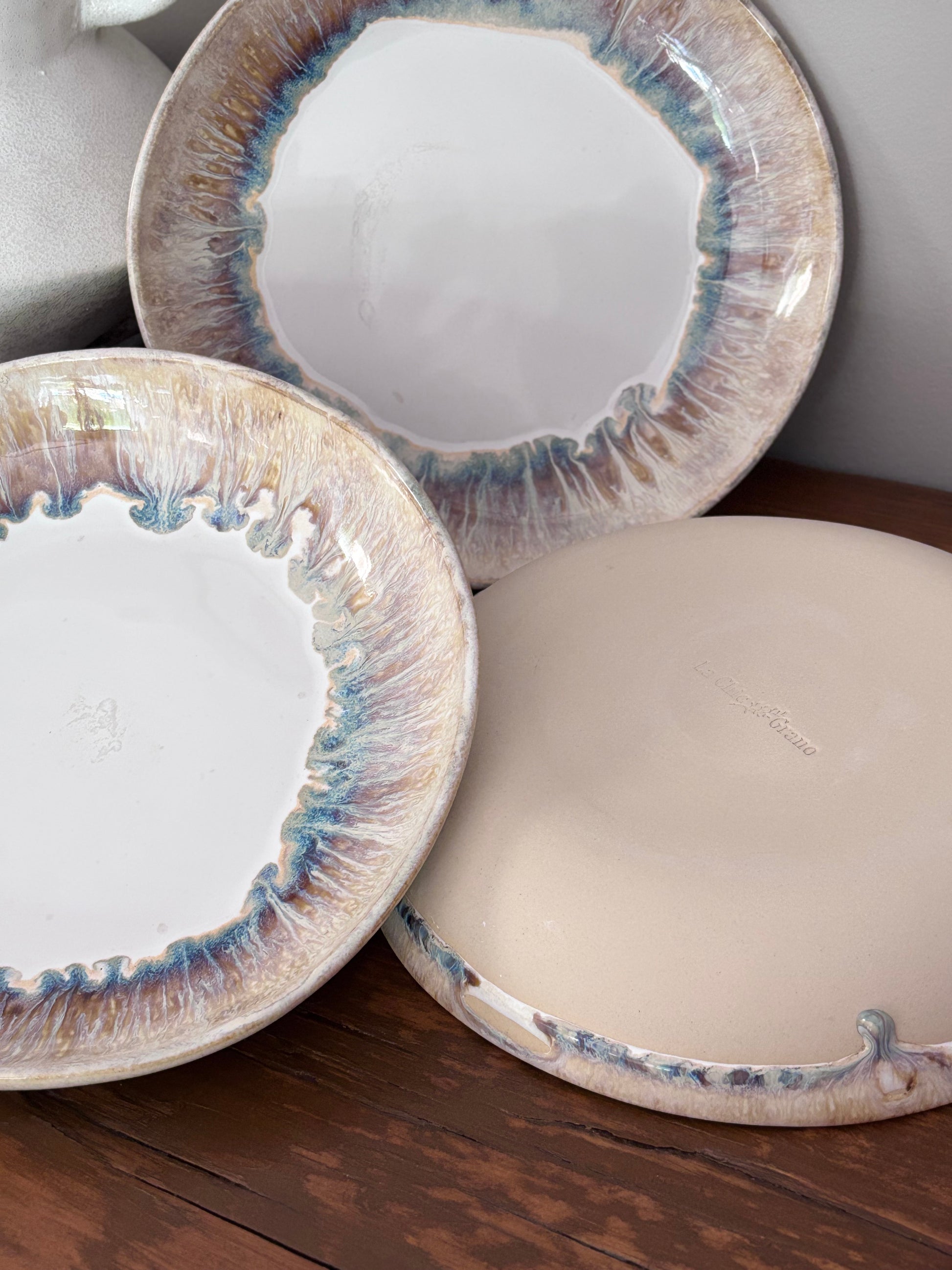 Assiette creuse façonnée à la main. Inspirée par les ciels nordiques, elle marie l’organique à l’élégant.