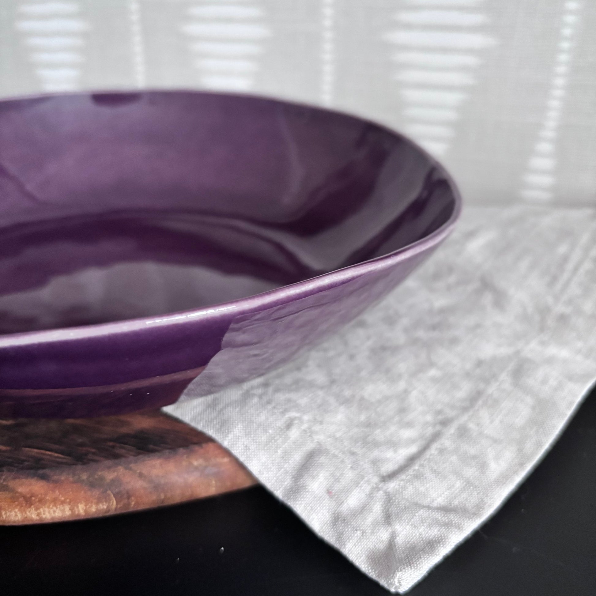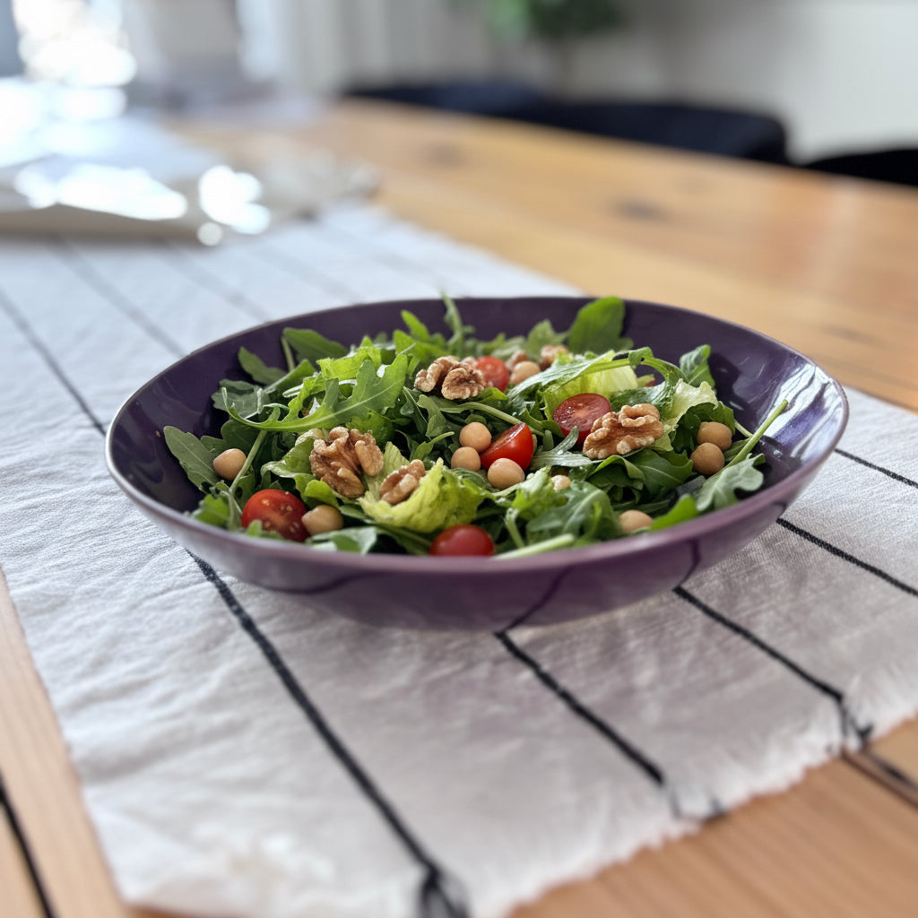 Apportez une touche de charme et de couleur à vos repas avec ce saladier aux teintes profondes d’aubergine et de mauve.
